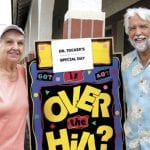MEL TOADVINE This “Over the Hill” birthday sign showed up last week in front of the medical offices of Dr. Michael Tucker in Lehigh. Tucker turned 59 last Wednesday and it was also a day for promoting his 21st annual charity golf tournament which raises money to buy medications and help those patients of his who are having financial problems. At left is Mariann Gaydos and at right, Dr. Michael Tucker. Gaydos helps to promote the annual golf tournament.