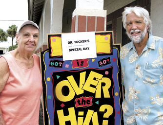 - MEL TOADVINE This “Over the Hill” birthday sign showed up last week in front of the medical offices of Dr. Michael Tucker in Lehigh. Tucker turned 59 last Wednesday and it was also a day for promoting his 21st annual charity golf tournament which raises money to buy medications and help those patients of his who are having financial problems. At left is Mariann Gaydos and at right, Dr. Michael Tucker. Gaydos helps to promote the annual golf tournament.