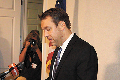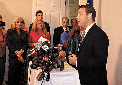CHUCK BALLARO U.S. Rep. Trey Radel addresses the media Wednesday from his Cape Coral Office. As promised, he then entered a treatment facility on Thursday.