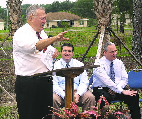 MEL TOADVINE Lee County Commissioner Cecil Pendergrass addresses group while officials look on.