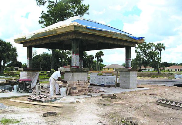 - MEL TOADVINE Workers are shown a few weeks ago finishing a pavilion in the new Trailhead Park in Lehigh.