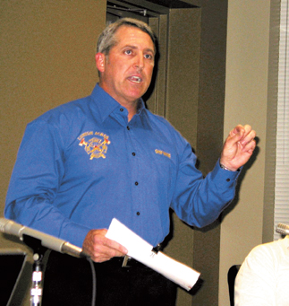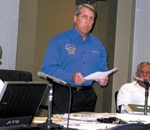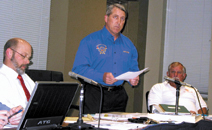 - MEL TOADVINE Chief John Wayne is shown here ready to answer questions from the audience about why the fire department needs to find an assessment type of funding to keep personnel and fire stations open. At left is attorney Richard Pringle and at right is Commissioner David Adams.