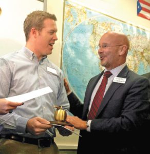 PHOTO SPECIAL TO THE CITIZEN Kevin Black, left, receives a Golden Apple from Marshall T. Bower, president and chief executive officer of The Foundation for Lee County Public Schools.