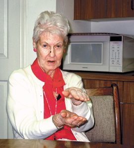 MEL TOADVINE Margaret Switzer describing how much paper work she is handling regarding the closing of the flea market at the First Congregational Church in Lehigh.