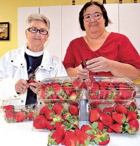 Sally Wogamuth and Fran Biggs have been busy for the past few days cutting up strawberries and coming up with a menu that includes “The Works,” a real strawberry lover’s dream, a bowl of strawberries.