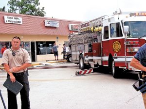 MEL TOADVINE Lehigh Acres Fire District Capt. Ralph Ketron, at left, in the area where a fire was reported on July 29 in a strip center in the 1400 block of Lee Blvd.