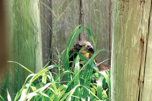 MEGHAN MCCOY After E8 was released into CROW’s outdoor flight enclosure the eaglet found vegetation in which to hide.