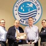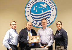 CARLA BRANTLEY Ken Thompson, second from left, receives a plaque as a gift for his service as chairman of the Lehigh Acres Municipal Services Improvement District, from the new chairman of the board, Mike Welch. Also shown at the ceremony is David Deetscreek, left, the new vice chairman, and the new secretary, Katyna Hoover, at right.