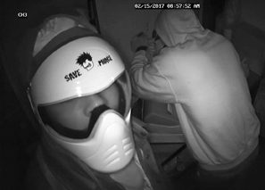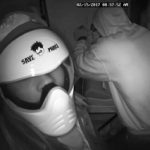 One of the suspects wore a black hoodie, skull print bandana, dark pants and carried a light-colored JanSport backpack. At one point, he wore a white motorcycle type helmet. The second suspect wore a white hoodie with grey or khaki pants.