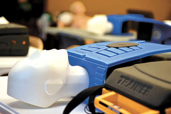 GABRIELA HARDAN A dummy used for to practice chest compressions is shown with an automated external defibrillator or AED, at right.
