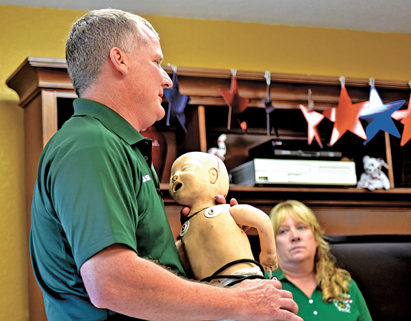 Using a mannequin, McDowell demonstrated how to use an automated external defibrillator.