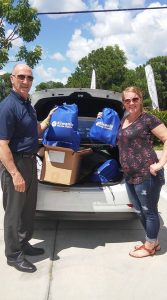 The Kiwanis Club of Lehigh Acres helped pack 1,000 student backpacks with school essentials Aug. 24-26 at the annual Kiwanis Florida District Convention, held at the Naples Grande Beach Resort in Naples. For helping, the local club received 24 backpacks to distribute to children in need in Lehigh. The club arranged to have the backpacks delivered to Houston by Kelly Johnson, who was planning to take a load of varied supplies to the flood victims. Shown are, from left, Ron Reineke and Johnson.