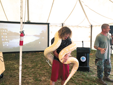 Steve Masek (far right) introduced Ivy, a labyrinth patterned Burmese python. PHOTO PROVIDED