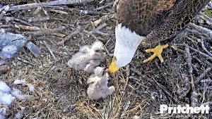 These feedings and other goings-on have been streamed live on the eagle cam. Sometimes, the feedings have been orderly, but usually there ends up being some kind of scrap, with E15 coming out the winner.