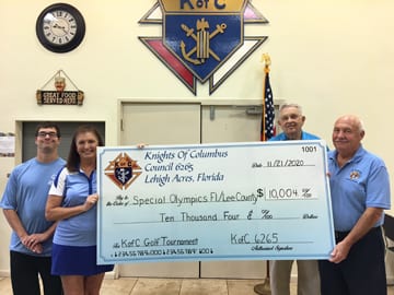 On Nov. 21, the Knights of Columbus presented the Special Olympics of Lee County with a check donation in the amount of $10,000. Proceeds were raised during a fundraising golf tournament held on Saturday, Nov. 7 at Majestic Gold Club.