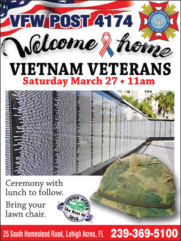 On Saturday, March 27 at 11 a.m., a Welcome Home Vietnam Veterans ceremony and presentation will be held outside at VFW Post 4174, 25 Homestead Rd. S, Lehigh Acres. The event will consist of a standard military ceremony where the colors are presented and the flag raised. There will be speakers and also a special presentation of coins to the veterans commemorating their service to the nation. The meal provided includes a roast pig, along with many other special edibles.