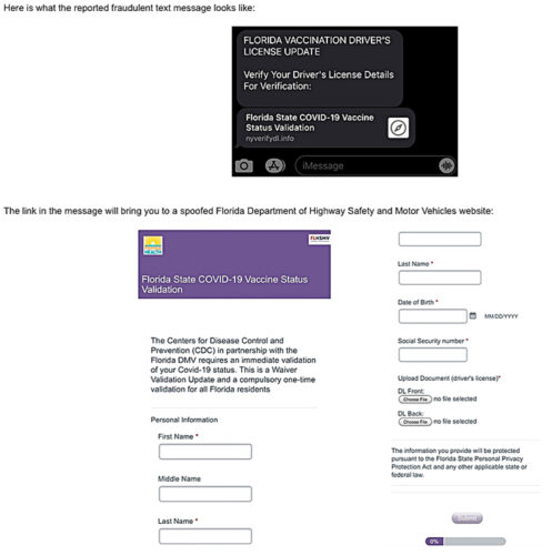 Attorney General Ashley Moody on Tuesday issued a Consumer Alert warning Floridians of a new COVID-19 vaccination text scam — fraudulent text messages being sent to residents asking for driver license details to remake licenses that show vaccination status. The text messages provide a link that sends targets to a spoofed Florida Department of Highway Safety and Motor Vehicles website with input boxes requesting Social Security and driver license information — including a place to upload a photocopy of a driver license.
