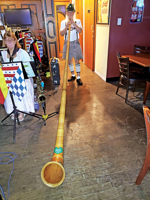 - Glen Ahlert plays the long “Ricola” horn (called an Alphorn) during The East Lee County Chamber of Commerce Fall Fest at EmJay’s on Friday. CHUCK BALLARO