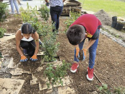 Students at Tice Elementary work on planting and mulching 100 plants. REFUGE/DDWS