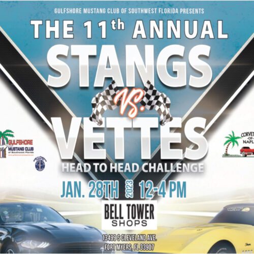 Together with Bell Tower, the GulfShore Mustang Club of Southwest Florida will present the club’s 11th annual Stangs vs. Vettes car show on Saturday, Jan. 28, from noon to 4 p.m. Showcasing hundreds of Mustangs and Corvettes, the event will be held in the front parking lot near Regal (between Blue Pointe & Grimaldi’s at the northeast corner of the shopping center). Prizes include $1,000 for the winning Mustang or Corvette host club, $500 for the second-place club, and two $250 participation prizes for one Mustang club and one Corvette club. Trophies will also be awarded to the top 10 Mustangs and top 10 Corvettes on display. To learn more, visit HERE.