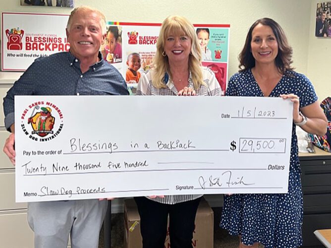 Scott Fischer Charities recently presented a check for $29,500 to Blessings in a Backpack of Southwest Florida to support their mission to feed children every weekend during the school year when kids often go without food. The money was raised through the generosity of sponsors and golfers at the 26th Annual Paul Sands Memorial Slaw Dog Invitational organized each year by Scott Fischer and Lisa Sands. Fischer and Sands presented the check to Blessings in a Backpack of Southwest Florida’s executive director Cecilia St. Arnold on Jan. 5.
