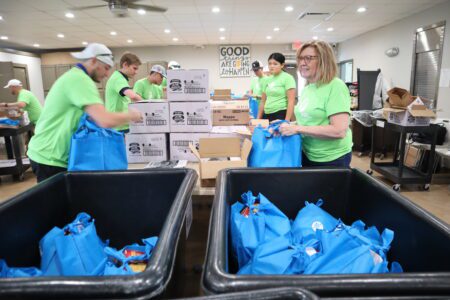 A dozen Florida Power & Light Company (FPL) volunteers including External Affairs Manager Charlotte Miller (on right, smiling) fill 450 hurricane meal kit bags at Community Cooperative in Fort Myers. The bags contain three days worth of shelf-stable food, as well as a "Storm Guide for Seniors" informational brochure.