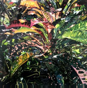 Though her subject matter is recognizable, her paintings are conceived and painted as abstracts. All the parts: foreground and background, positive and negative spaces are treated as equally important. The branches, vines, flowers, and leaves become shapes, lines, and textures which make a complex abstraction when viewed up close. The imagery is sometimes larger than life, with some of the featured pieces reaching up to five feet in one direction, and all are painted in a ‘super real’ manner. The intense colors are a result of many layers of acrylic paints. Martin encourages the viewer to look closely at the painting and to imagine being a part of this private place.