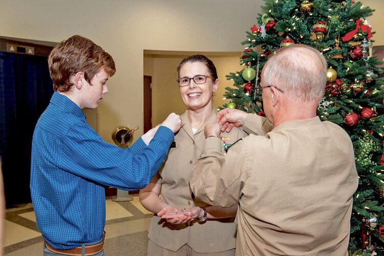 Dianna Wolfson, center, the director of Fleet Maintenance for U.S. Fleet Forces Command, at the ceremony where she was promoted to rear admiral. Placing pins on her uniform are her son, Hunter, left, and Admiral Daryl Caudle, commander of U.S. Fleet Forces Command. PROVIDED