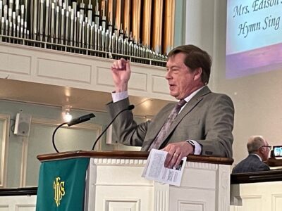 Rev. Roger Peterson leads audience in song. PROVIDED