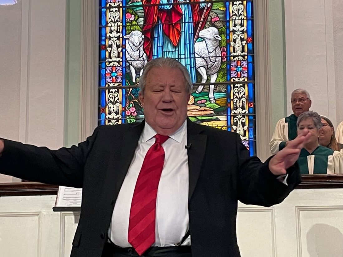- Rev. Roger Peterson leads audience in song. PROVIDED