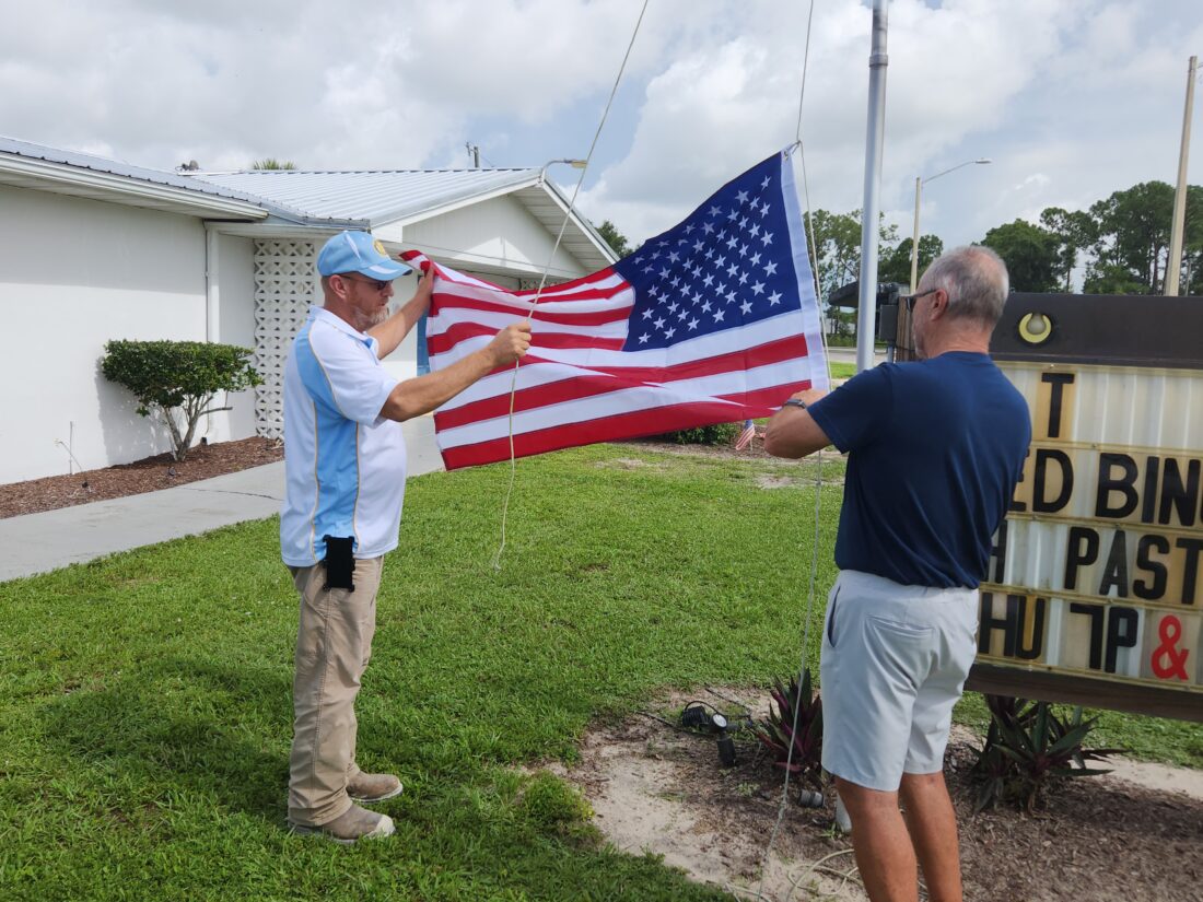 - Williams Devers and Mark Giosa of the Moose Lodge raise their new flag following a special event at their building in Lehigh Acres on Tuesday. Comcast presented them with the new flag. CHUCK BALLARO