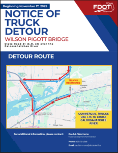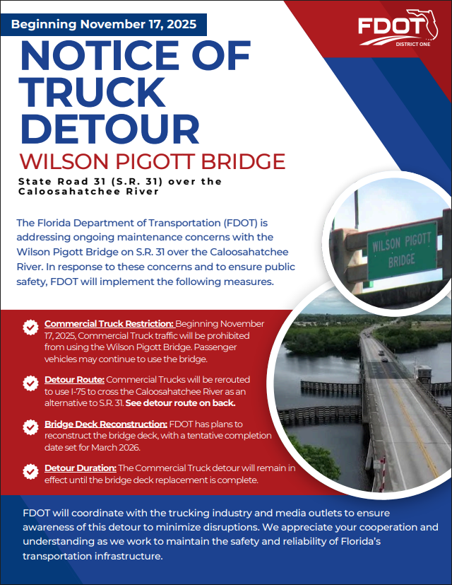 The Florida Department of Transportation District One announces that beginning Monday, Nov. 17, all commercial trucks (any vehicle/vehicle trailer combination with a gross vehicle weight rating of 26,001 pounds or more) will be detoured from using the Wilson Pigott Bridge on State Road 31 over the Caloosahatchee as part of ongoing bridge maintenance efforts.